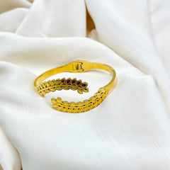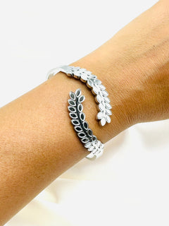 Design : Bracelet rigide avec des motifs en forme de feuilles.