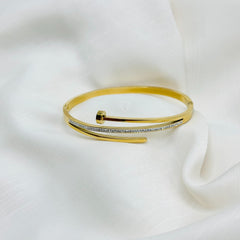 Le bracelet "Clara" se distingue par son design contemporain et épuré. Réalisé en acier inoxydable doré, il arbore une ligne fine et délicate ornée de cristaux scintillants. Le détail en forme de clou sur le devant apporte une touche de modernité et d'audace, créant un équilibre subtil entre minimalisme et sophistication.