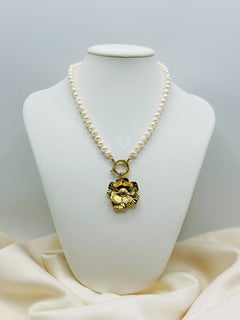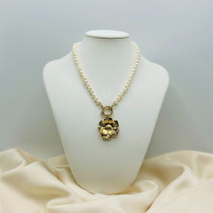 Design : Un collier à perles classique avec un twist contemporain grâce au pendentif floral doré, créant un équilibre parfait entre le traditionnel et le moderne.