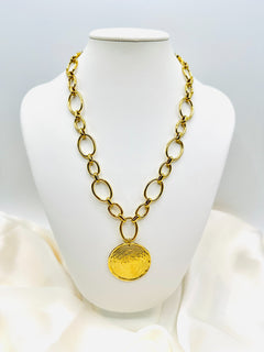 Design : Maillons ovales volumineux et pendentif circulaire gravé au centre.