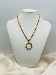 Ce collier, au design épuré et raffiné, se distingue par un pendentif en forme de cercle orné de détails délicats, suspendu à une chaîne dorée. L'ensemble offre un équilibre parfait entre modernité et élégance, ce qui en fait une pièce incontournable pour compléter n'importe quelle tenue.