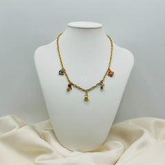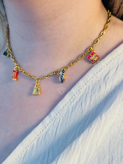 Design : Chaîne en or avec des pendentifs colorés, représentant divers objets tels que des sacs et des chaussures