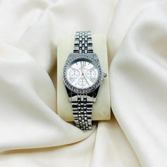 C'est une montre au design luxueux et raffiné ornée de cristaux brillants, ajoutant une touche de glamour et d'élégance.
