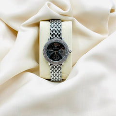 C'est une montre au design luxueux et raffiné ornée de cristaux brillants, ajoutant une touche de glamour et d'élégance.